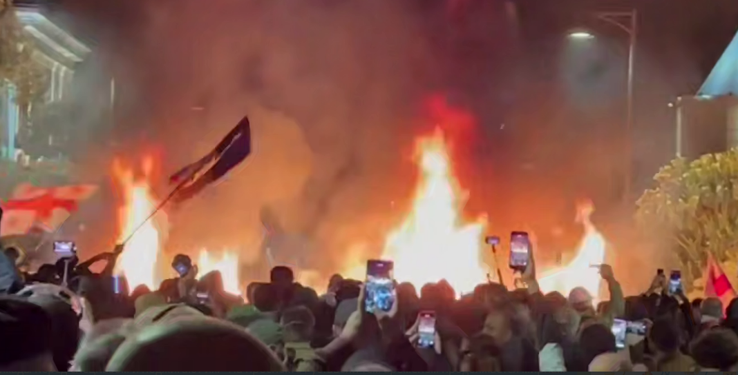 На Орбелиани в Тбилиси близ Президентского дворца продолжает сохраняться напряженная ситуация. Протестующие перед кордоном робокопов построили баррикады и подожгли их, передает Tbilisi Life.